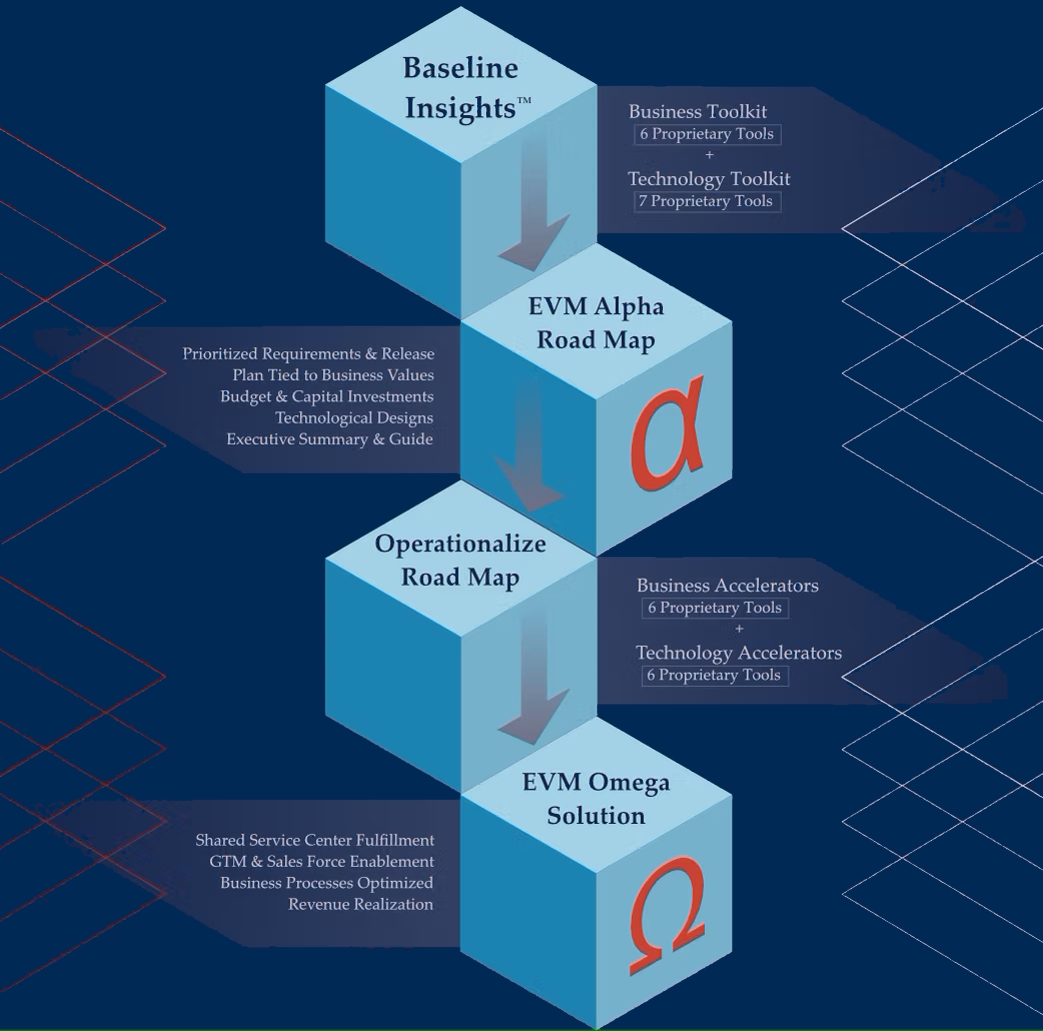 NVC’s Enterprise Value Maximization (“EVM”) Framework lays the foundation for attainable and sustainable excellence regardless of a clients’ challenges. This proprietary methodology begins with our Baseline Insights™ Assessment, which bundles business and technology tools, to generate the “EVMα” Roadmap. We then operationalize the Alpha Roadmap by applying business and technology accelerators to generate our “EVMΩ” solution. The Omega solution is a disruptive, re-engineered, and optimized plan for revenue realization and enterprise value maximization which ensures Attainable & Sustainable Excellence.